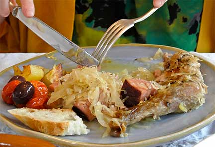 The other day, thinking about Mother and Daddy’s food quirks inspired me to make Mother’s Choucroute Garnie recipe (slightly modified, of course, since I’m constitutionally incapable of sticking to a precise recipe). It’s perfect party fare for cold weather. She braised sauerkraut to make it tender, cooked it with onion and apple for sweetness, added wine for tang, and precooked meats to remove some of their fat. It’s quite delicious and makes wonderful leftovers. Mother advises making it a day ahead of company dinners for completely stress-free entertaining.