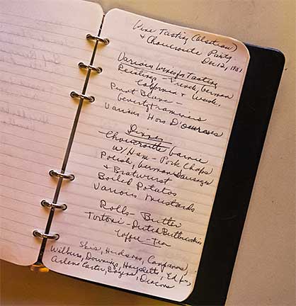 Mother’s Menu Journal. Wine Tasting (Alsatian) & Choucroute Party for 20, December 12, 1981. Various Wines for Tasting: Reislings-French, German, California & Washington; Pinot Blanc; Gewurztraminers; Various Hors D’oeuvres. Dinner: Choucroute Garnie with Ham, Pork Chops, Polish, German Sausages, & Bratwurst; Boiled Potatoes; Various Mustards; Rolls & Butter; Tortoni with Dutch Butter Cookies; Coffee & Tea. Guests: Skis, Hudsons, Campanas, Wilburs, Downings, Haysletts, Ed L., Arlene Carter, Bogens, Deacons