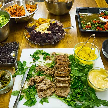 For appetizers and salads, I made a selection of recipes from my book, Tastes Like Home: Mediterranean Cooking in Alaska: Roasted Olives, Beets and Skordalia, Spanakopita, Carrot, Radish and Caper Salad, Romaine, Dill and Lettuce Salad.