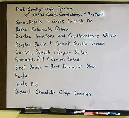 Cooking for firemen sounded like a fun time (and it was). We immediately started planning a menu. Sunée invited Anna Thomas, a fabulous baker, to join us and make dessert. I agreed to make appetizers and salads. Sunée made Provençal Beef Stew (Daube) and pasta, starting with 18 pounds of fresh meat.