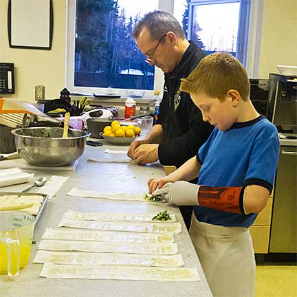 By this time, Lyle had arrived. Lyle is a fireman’s son and interested in becoming a professional chef. Last summer, he took a cooking class at UAA and learned how to make puff pastry. I’d met Lyle at a recent Barnes & Noble book signing event and invited him to come cook with us.