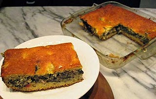 Spread a little less than half the cornbread mix over bottom of buttered pan. Spread filling over cornbread mix. Put dollops of remaining cornbread mix over the greens, trying to cover as much of the top as you can with dollops; use a spatula or your finger to spread the dollops into a thin layer that completely covers the greens. Bake in preheated oven for 40-45 minutes, or until top crust is golden brown and filling bubbles up sides of pan.