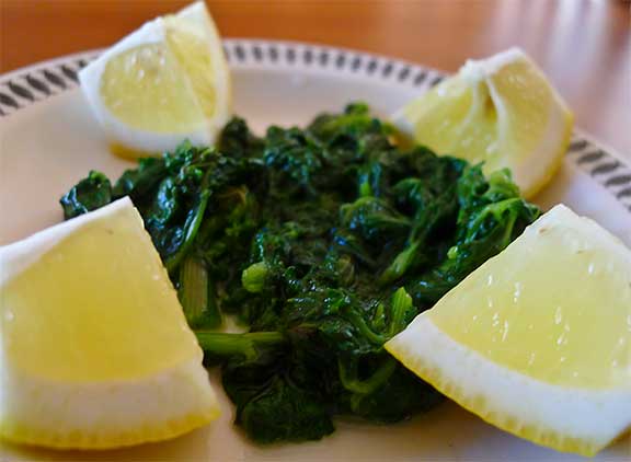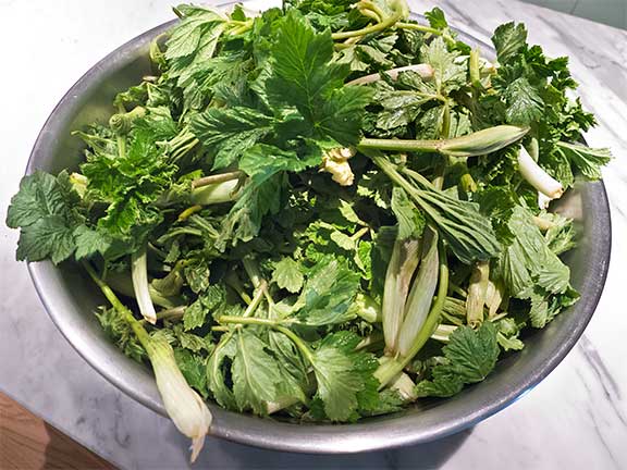Today’s recipe is for Greek Wild Greens with Lemon Dressing made with cow parsnip. I’ll post recipes for Oven-roasted Cow Parsnip and Cow Parsnip Chips in the next couple days. Try them all! Who knows, you might throw off the reins off loathing and join my ranks as a cow parsnip lover!
