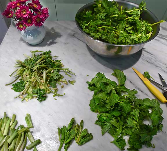 Breaking Down Cow Parsnips. Clockwise from flowers: Whole cow parsnip shoots, leaves only, base of stems only, debris from cleaning cow parships. Photograph by Laurie Constantino.